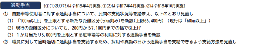 人事院勧告には、「2026年4月から、上限を『100㎞以上』とし、『60㎞以上』の部分について5㎞刻みで新たな距離区分を設ける」、「1か月当たり5,000円を上限とする駐車場等の利用に対する通勤手当を2026年4月から新設する」とあります。