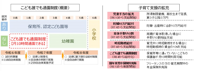 2025年4月からの雇用保険の「出生後休業支援給付」「育児時短就業給付」は、子ども・子育て支援金を活用した子育て支援策として、既に実施されています。また、児童手当の拡充や親の就労の有無にかかわらず保育園に通いやすくする「こども誰でも通園制度」の給付なども、同様です。