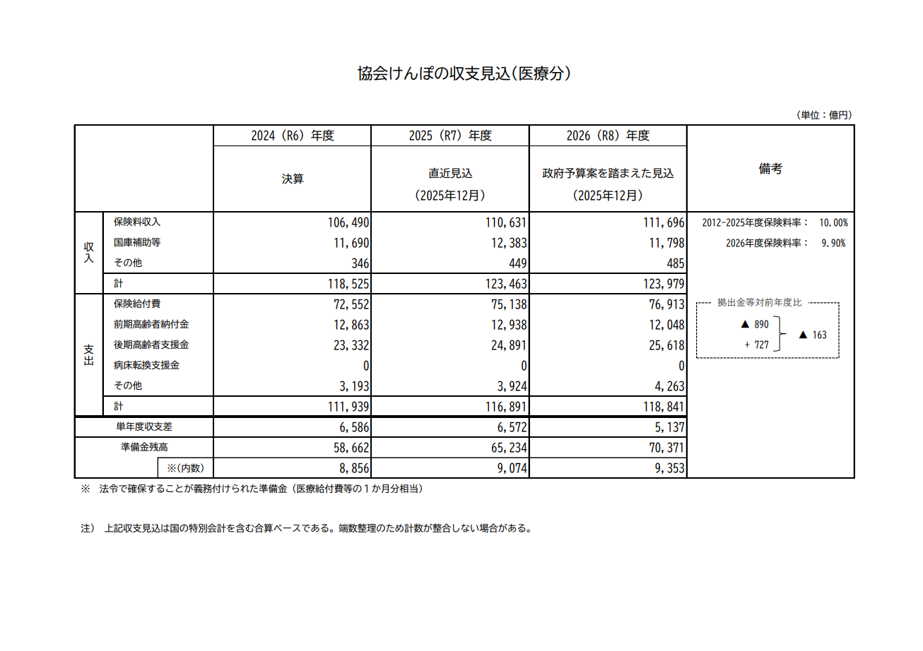 【全国健康保険協会「2026(令和8)年度政府予算案を踏まえた収支見込みについて(概要)」】