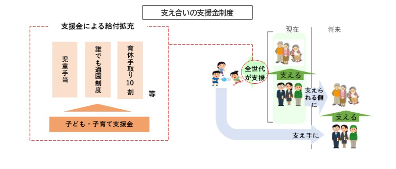 この制度は、今の現役世代が、将来高齢者となったときに社会を支える若い世代を育てるという「支え合いの循環」を維持するため、子育てを全世代で支えることを目的としています。