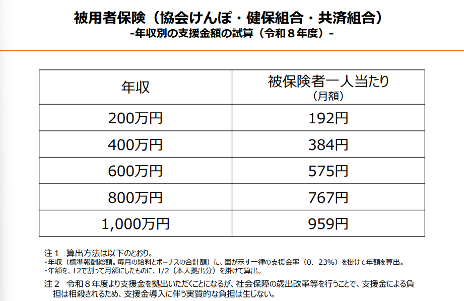 子ども家庭庁が12月26日に公表した年収別推計によれば、協会けんぽ・組合健保の被保険者一人当たりの月額負担は次のように示されています。ただし、社会保障の歳出改革等を行うことで、支援金による負担は相殺されるため、支援金導入に伴う実質的な負担は生じない、とされています。