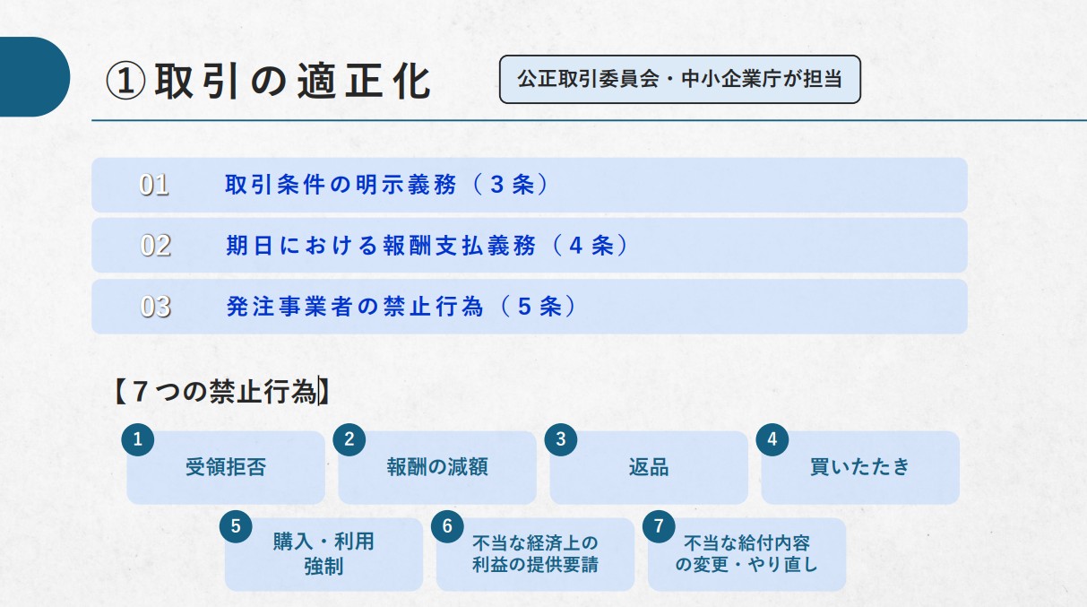 2024年11月に施行された「特定受託事業者に係る取引の適正化等に関する法律」(フリーランス・事業者間取引適正化等法)は、フリーランスとの業務委託取引について、「取引の適正化」と「就業環境の整備」の2つの観点から、発注事業者が守るべき義務と禁止行為を定めています。